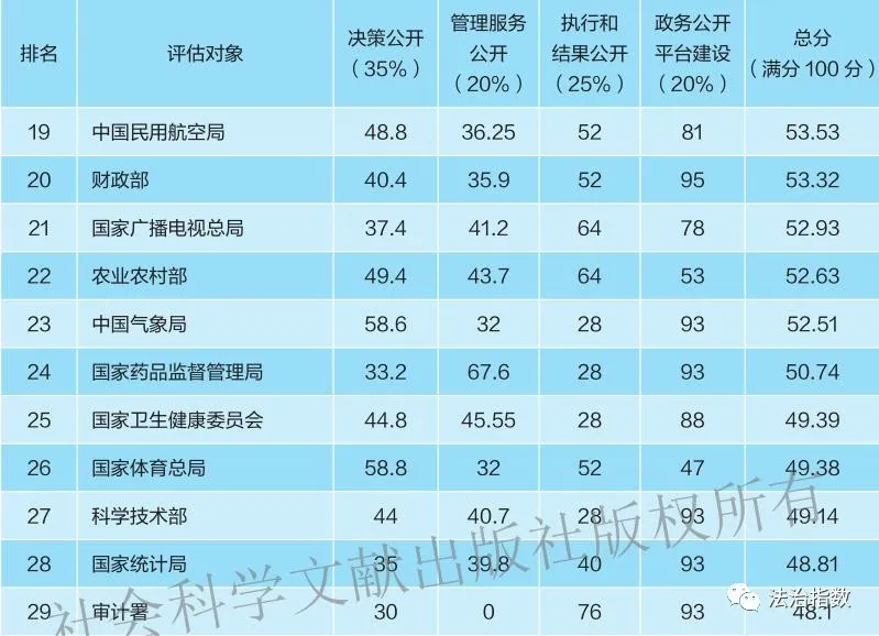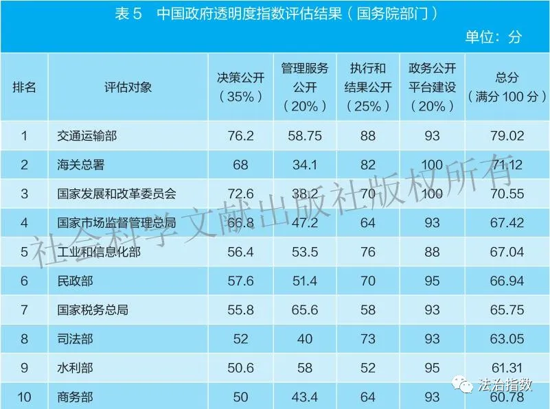 2020年6月8日,中国社会科学院法学研究所、社会科学文献出版社联合举办的“法治蓝皮书《中国法治发展报告No.18(2020)》发布暨中国法治发展理论研讨会”在北京举行,并发布了“中国政府透明度指数报告(2019)”,连续11年对49家国务院部门、31家省级政府、49家较大的市政府和125家县(市、区)政府的政务公开工作开展了第三方评估。《法治蓝皮书》公布2019年政府透明度评估结果。基于对决策公开、管理服务公开、执行和结果公开、政务公开平台建设、依申请公开的评估,2019年政府透明度指数评估结果显示,国务院部门排在前列的有:交通运输部、海关总署、国家发展和改革委员会、国家市场监督管理总局、工业和信息化部、民政部、国家税务总局、司法部、水利部、商务部。省级政府排在前列的有:北京市、上海市、广东省、贵州省、四川省、山东省、安徽省、江苏省、宁夏回族自治区、天津市。较大的市排在前列的有:厦门市、广州市、深圳市、成都市、青岛市、宁波市、银川市、合肥市、淄博市、苏州市。县(市区)政府排在前列的有:上海市普陀区、浙江省宁波市江北区、北京市西城区、山东省威海市荣成市、广东省深圳市罗湖区、上海市虹口区、浙江省温州市瓯海区、山东省济南市历下区、广东省广州市越秀区、上海市浦东新区。《法治蓝皮书》指出,随着实施十年有余的《政府信息公开条例》修订并实施,政务公开和政府信息公开制度不断完善,公开范围继续扩展,公开要求进一步细化,公开效果不断提升,助力国家治理能力现代化。首先,2019年,政务公开规定得到进一步完善,政务公开要求继续细化。修订后的《政府信息公开条例》从落实“以公开为常态、以不公开为例外”的原则入手,扩大了主动公开的范围,取消了关于依申情公开“三需要”表述,细化和完善了依申情公开流程,同时,加大了《条例》各项制度的落实保障力度。国务院主管部门也发布文件,细化关于政务公开的有关要求。其次,各级政府以政务公开为手段,助力提升治理水平。政务公开在优化营商环境、规范重大行政决策程序、加强法治政府建设与责任落实督察工作、加强和规范事中事后监管、加快推进社会信用体系建设构建等方面的作用日益凸显。再次,各级政府稳步推进决策公开,有序参与规范用权。有32家国务院部门、31家省级政府、38家较大的市政府以及60家县(区)政府门户网站设置了意见征集专门栏目,集中发布重大决策预公开草案及征集公众意见的情况。部分评估对象利用网站栏目设置等,集约化公开意见征集的草案、反馈意见等,方便公众参与及查看反馈意见,涉及6家国务院部门、10家省级政府、25家较大的市政府及23家县(市区)政府。部分评估对象对重大决策草案进行解读。涉及3家国务院部门、1家省级政府、2家较大的市政府、1家县(区)政府。另外,各级政府机关注重细化政务服务信息、便利信息查询获取。评估显示,2019年政务服务事项目录的公开情况较好。43家国务院部门和被评估的所有的省、市、县(市区)三级政府均公开了政务服务事项目录,国务院部门的公开率由上一年的84%提高到87.76%,省级、较大的市及县(市区)三级政府则由上一年的74.19%、51.02%、57%全部提升到100%。此外,多数评估对象集中展示了“全生命周期”办事服务事项。有26家省级政府、42家较大的市政府、125家县(市、区)政府能够集成展示市场主体(企业)“全生命周期”办事服务事项,占比分别为83.87%、85.71%、100%;有21家省级政府、35家较大的市政府、124家县(市、区)政府能够集成展示个人“全生命周期”办事服务事项,占比分别为67.74%、71.43%、99.20%。部分对象梳理并公开了确需保留的证明事项。有7家国务院部门、10家省级政府、19家较大的市政府、21家县(市、区)政府梳理并公开了确需保留的证明事项清单,各级政府已陆续开展了相关清理工作,并公开了确需保留的证明事项清单。最后,各级政府机关还加大执法信息公开,规范行政执法行为。部分评估对象行政执法平台公开情况较好。如广东省建设了覆盖省、市、县(区)、镇四级行政执法信息的行政执法信息公示平台,公示信息范围覆盖行政处罚、行政强制、行政检查、行政征收征用、行政许可等各类行政执法行为,平台中分为“行政执法信息事前公开”和“行政执法信息事后公开”子栏目。34家国务院部门、31家省级政府、49家较大的市政府、125家县(市、区)政府单位中有96家政府门户网站集中设置了“双随机”专栏,集中发布“双随机、一公开”信息。在行政处罚信息公开方面,各级政府行政处罚事项清单公开情况较好。31家省级政府、47家较大的市政府、116家县(市、区)政府网站集中公开了各部门的行政处罚事项目录,公开比例分别达到100%、95.92%和92.8%。各级政府市场监督管理部门行政处罚结果公开较好。28家省级政府、43家较大的市政府、105家县(市、区)政府公开了2019年度处罚结果,公开率分别达到90.32%、87.76%和84%。《法治蓝皮书》指出,公开透明作为国家治理体系和治理能力现代化的重要路径之一,作为实现共建共治共享目标的重要手段之一,必将日益发挥不可替代的作用。2019年,虽然政务公开进展和成效明显,但决策公开、执行公开、服务公开、结果公开等方面仍然存在各种问题,集中表现为落实公开责任不到位、政务